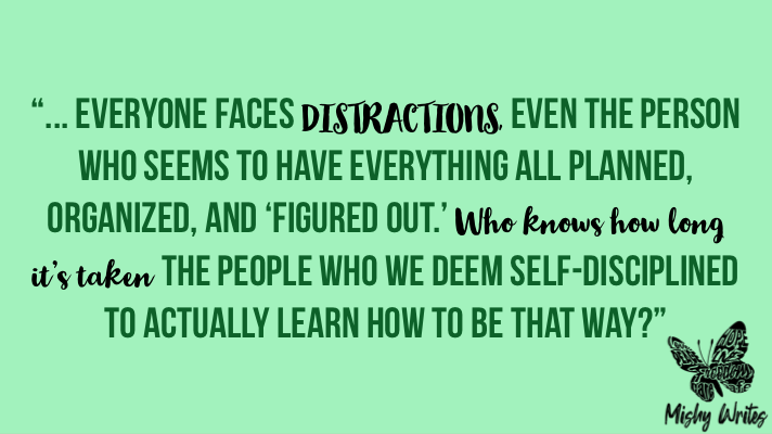 As I say all the time when I’m giving advice or motivating, I give these tips to myself while I give them to you. Because everyone faces distractions, even the person who seems to have everything all planned, organized, and figured out. Who knows how long it’s taken the people who we deem self-disciplined to actually learn how to be that way? 🤷🏽♀️